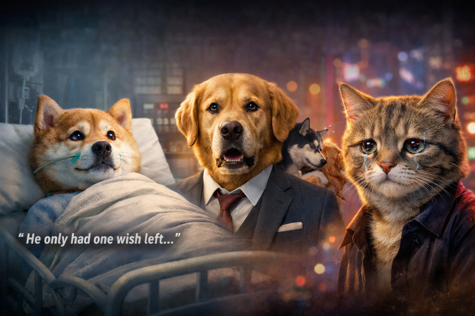 A Shiba Inu lies on a hospital bed, eyes glistening, a soft instrumental track swelling in the background as a caption reads, “He only had one wish left.” Cut to a golden retriever in a sharp suit, caught in a betrayal scandal involving his best friend. Then a pair of cats, mid-breakup, exchanging accusatory glances under neon city lights, one storming out dramatically while the other collapses in tears.